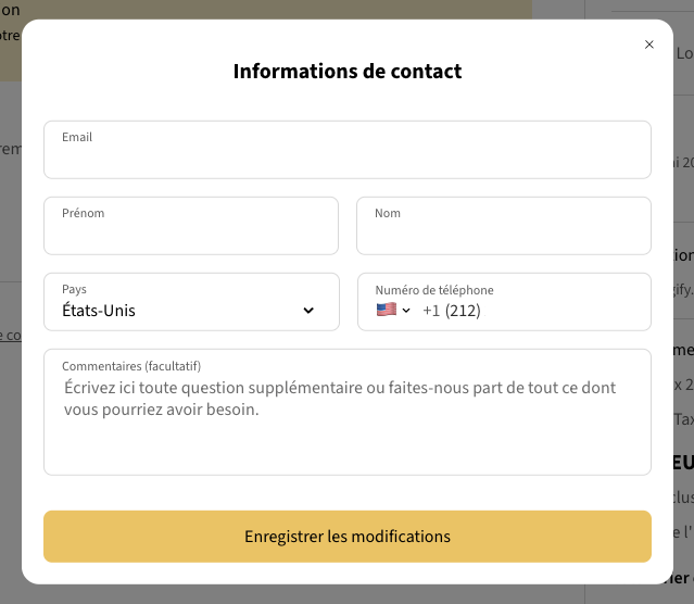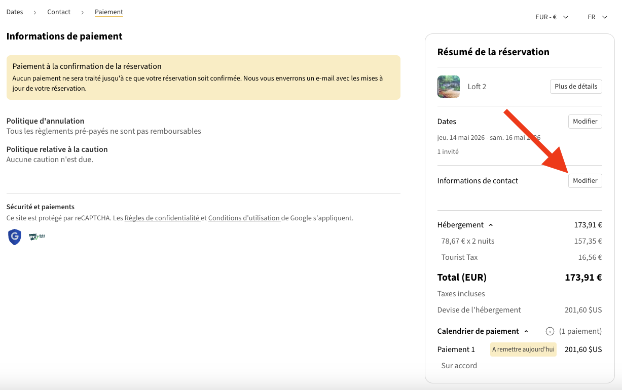 Pour ce faire, il doit cliquer sur Modifier à côté d'Informations de contact sur la page de paiement et saisir les nouvelles informations.