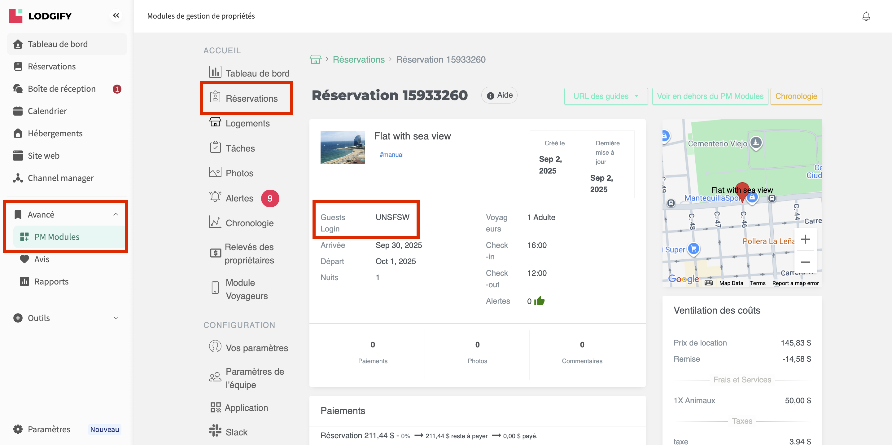 Si vous souhaitez donner aux invités l’accès au portail voyageurs sans leur demander de remplir le formulaire d'enregistrement en ligne, vous pouvez leur envoyer cette URL générique : https://guests.lodgify.com/login. En plus du lien, ils auront besoin de leur référence de réservation, que vous pouvez trouver en allant dans les PM Modules, dans la section Réservations, à l’intérieur de la réservation de l’invité, sous le champ Guests login :