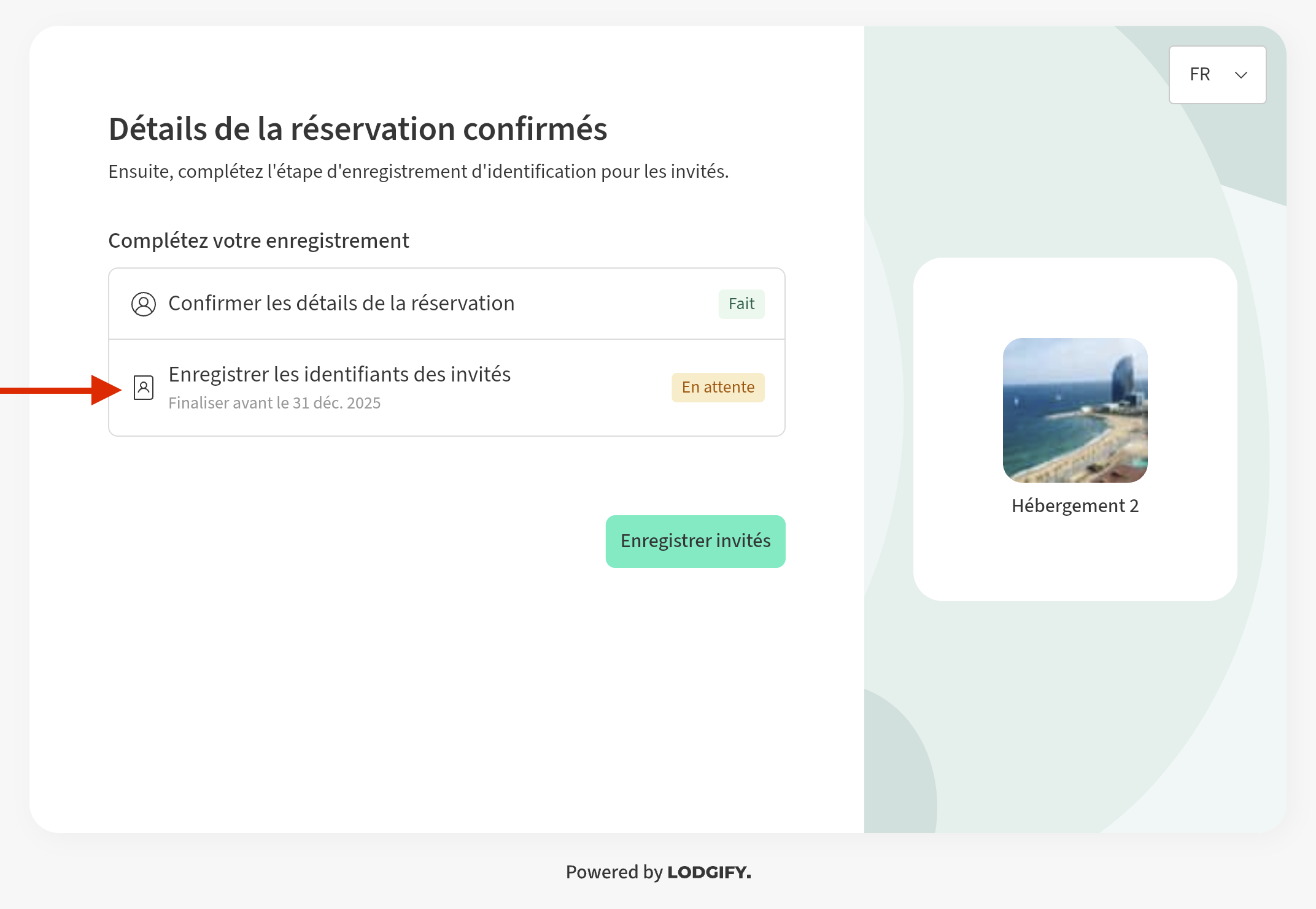 2. Après avoir complété les informations dans le formulaire d'enregistrement de la réservation, si le formulaire d'enregistrement des invités est activé, l’Invité sera automatiquement invité à le compléter :