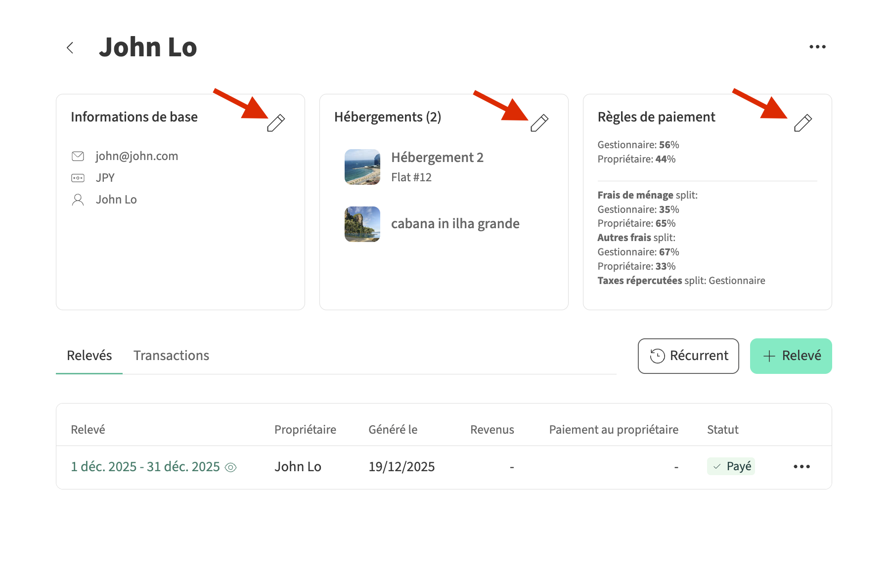 Pour modifier les informations du profil, les logements associés ou les règles de paiement d'un propriétaire, suivez ces étapes :
