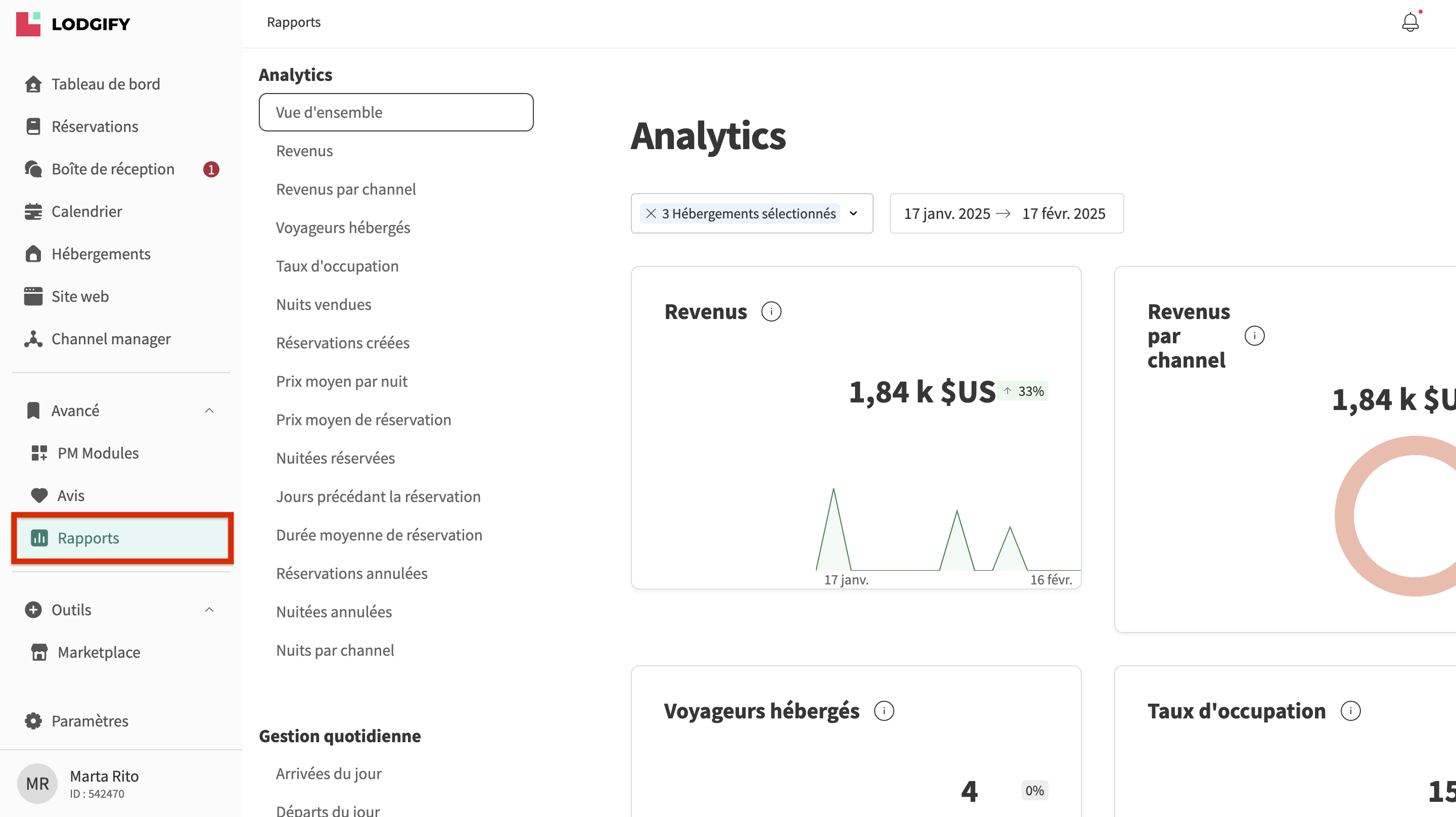 La section Rapports de votre compte Lodgify vous permet de garder une vue d'ensemble de votre activité avec des analyses, des transactions et l'occupation actuelle de vos logements.