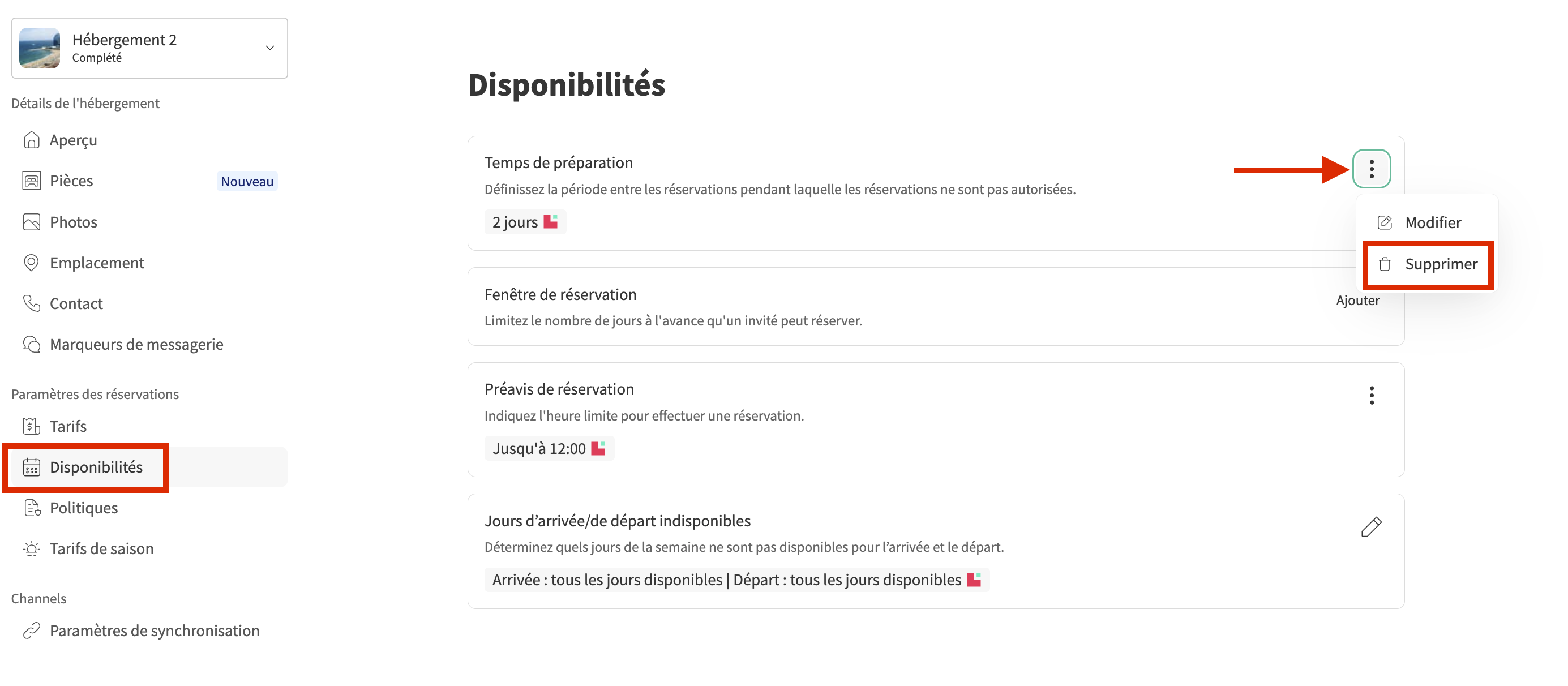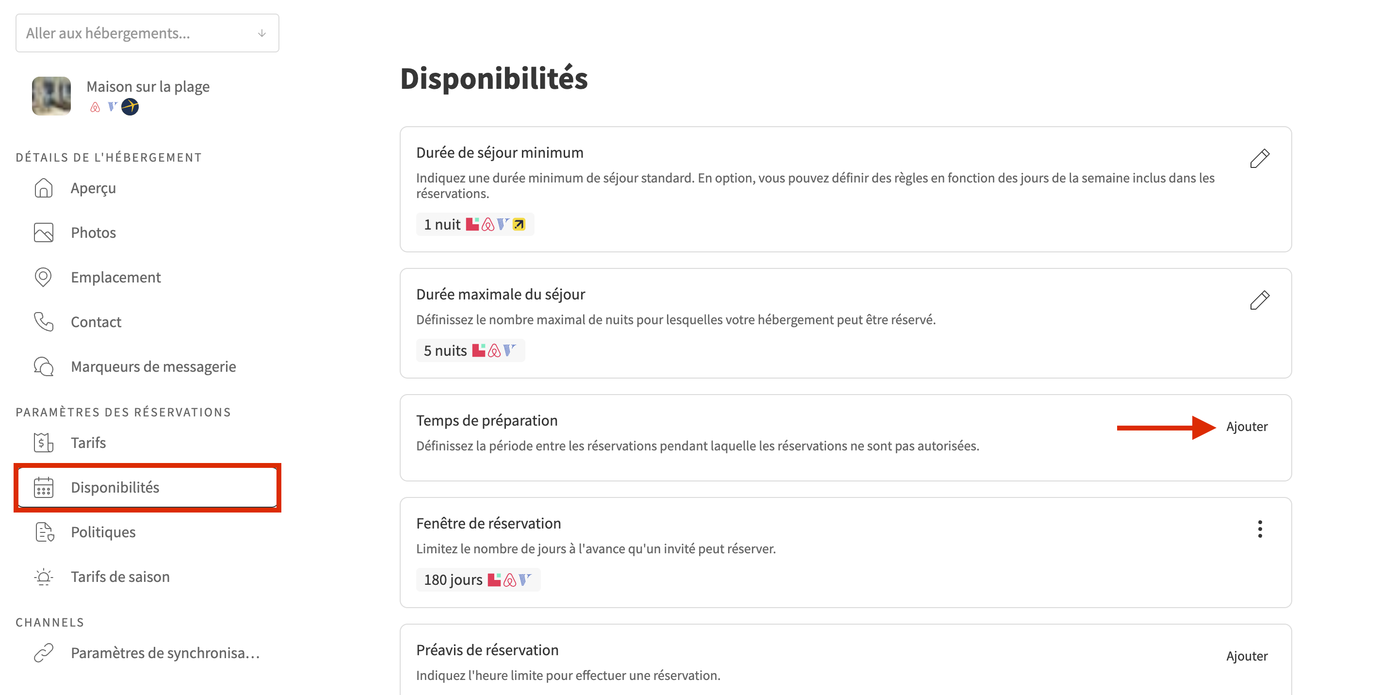 Pour établir un temps de préparation pour votre hébergement, vous devez aller dans les Paramètres de l'hébergement.