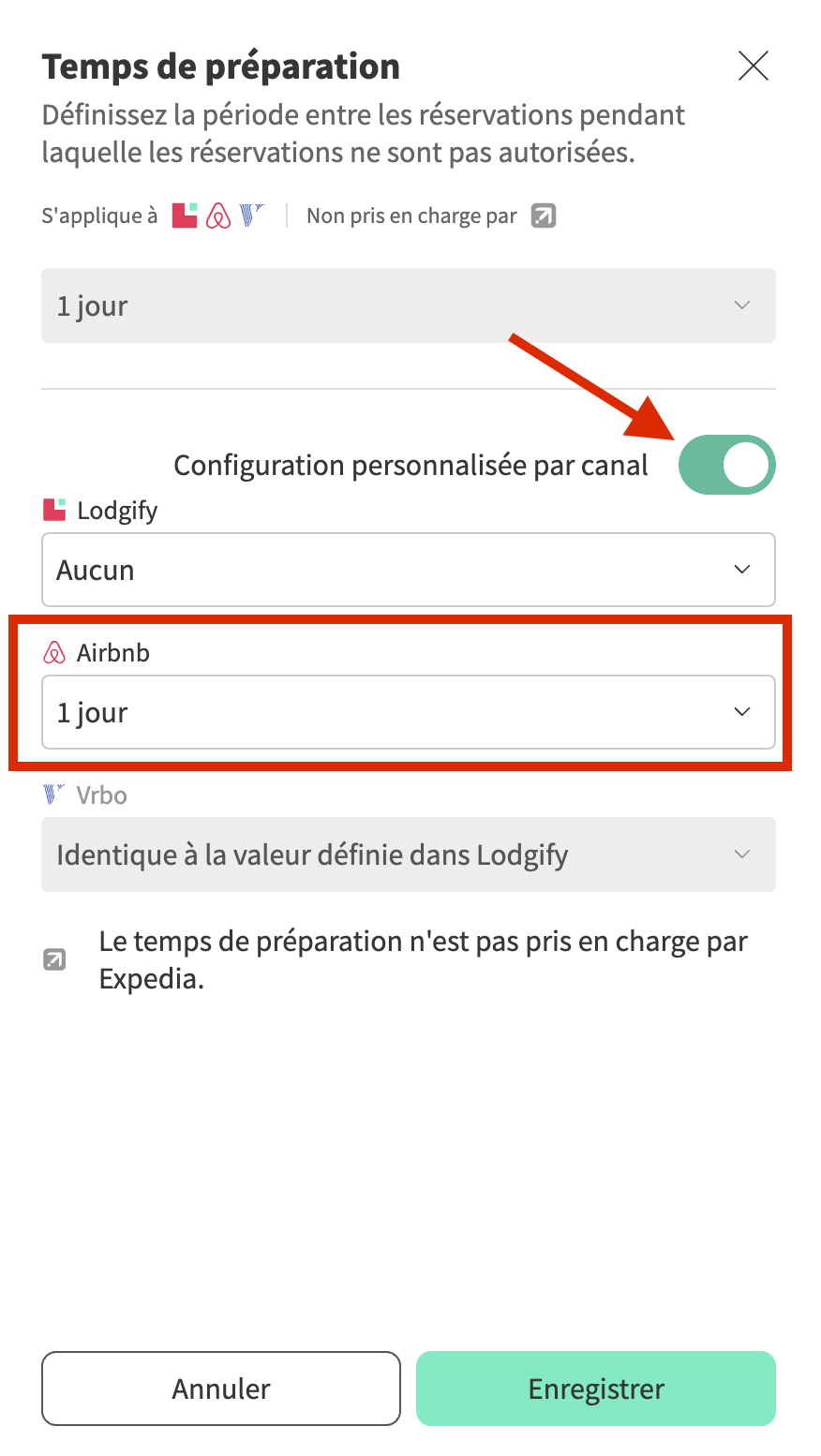- Si votre hébergement est connecté à Airbnb, vous pouvez définir un temps de préparation différent pour ce canal en sélectionnant Configuration personnalisée par canal, puis en configurant un temps de préparation spécifique pour Airbnb :