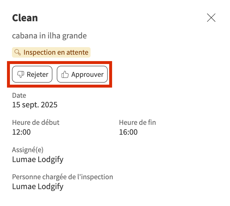 Certaines tâches, comme le ménage ou la maintenance, peuvent nécessiter un contrôle qualité une fois terminées. Si l’inspection est activée, le superviseur peut vérifier le travail et l’approuver ou le rejeter.