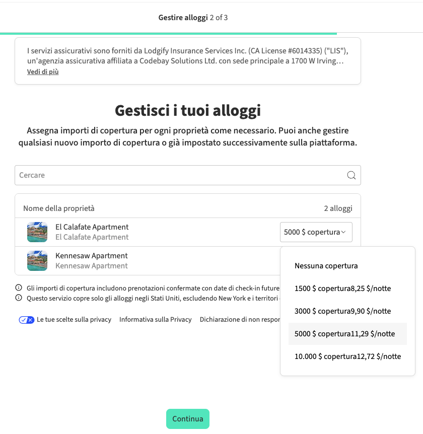I tuoi alloggi sono visualizzati e puoi assegnare importi di copertura per ciascun alloggio. Clicca su Continua.
