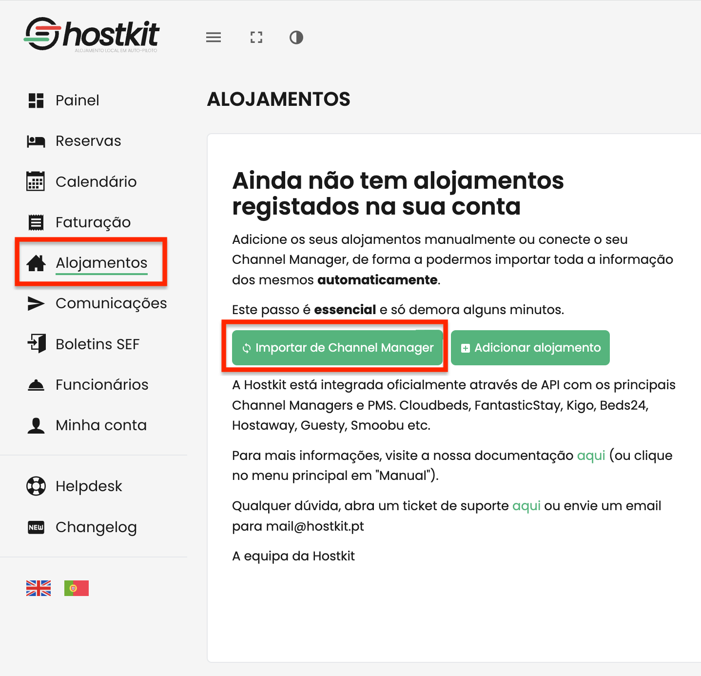 - Nel menu a sinistra, clicca su Alojamentos e seleziona Importar de Channel Manager: