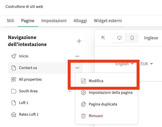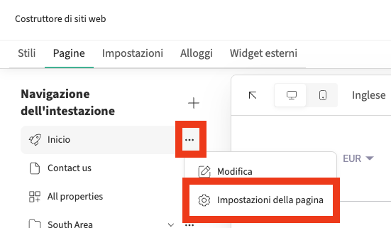 Puoi modificare i titoli delle pagine nella sezione Pagine del tuo costruttore di siti web. Clicca sui tre punti accanto alla pagina e seleziona Impostazioni pagina.