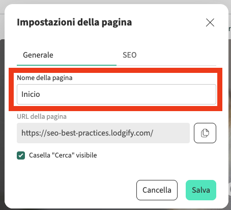 In un pop-up, regola il titolo della pagina nel campo Nome della pagina.