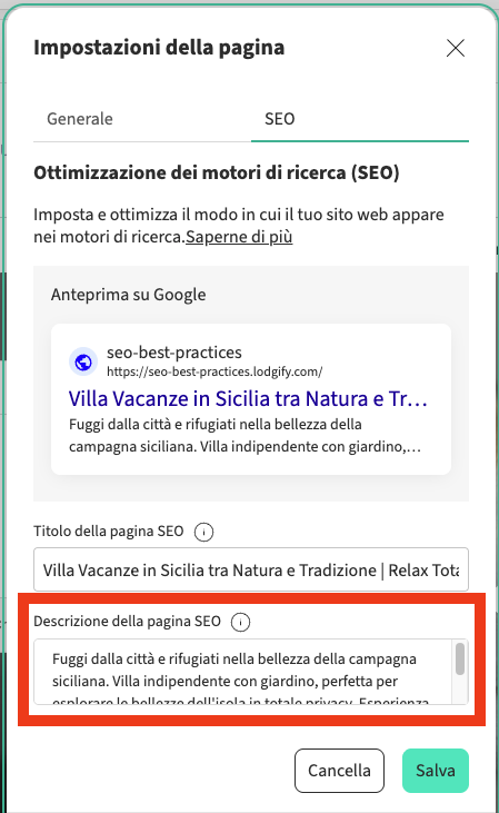 In un pop-up - sotto SEO - regola la descrizione della pagina nel campo Descrizione SEO della pagina.