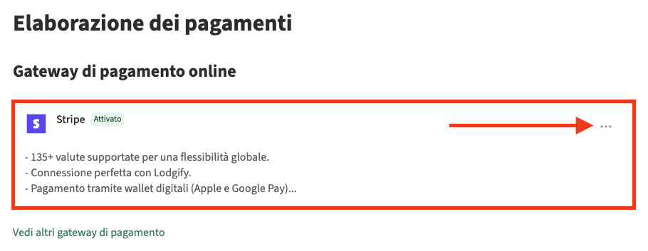 Clicca sui tre punti all'interno della sezione Stripe e seleziona Impostazioni.