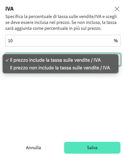 | Configura l'IVA per il Prezzo base | Configura l'IVA per le Commissioni |