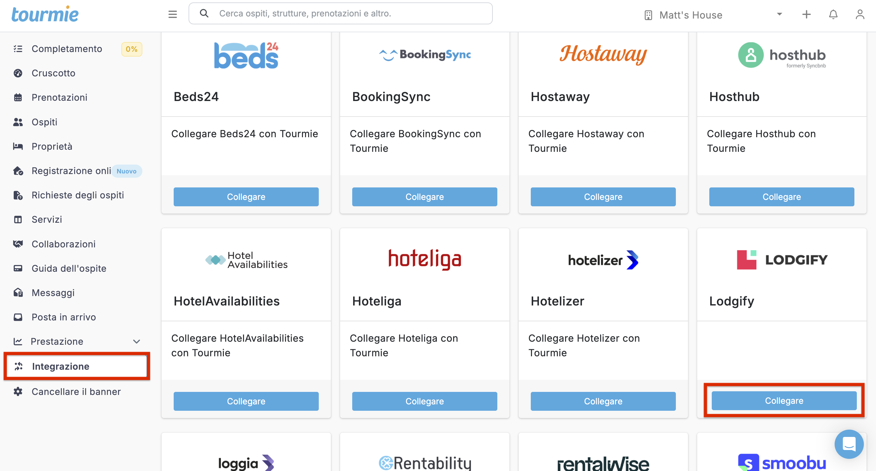 - Vai quindi alla sezione Integrazioni e trova Lodgify.