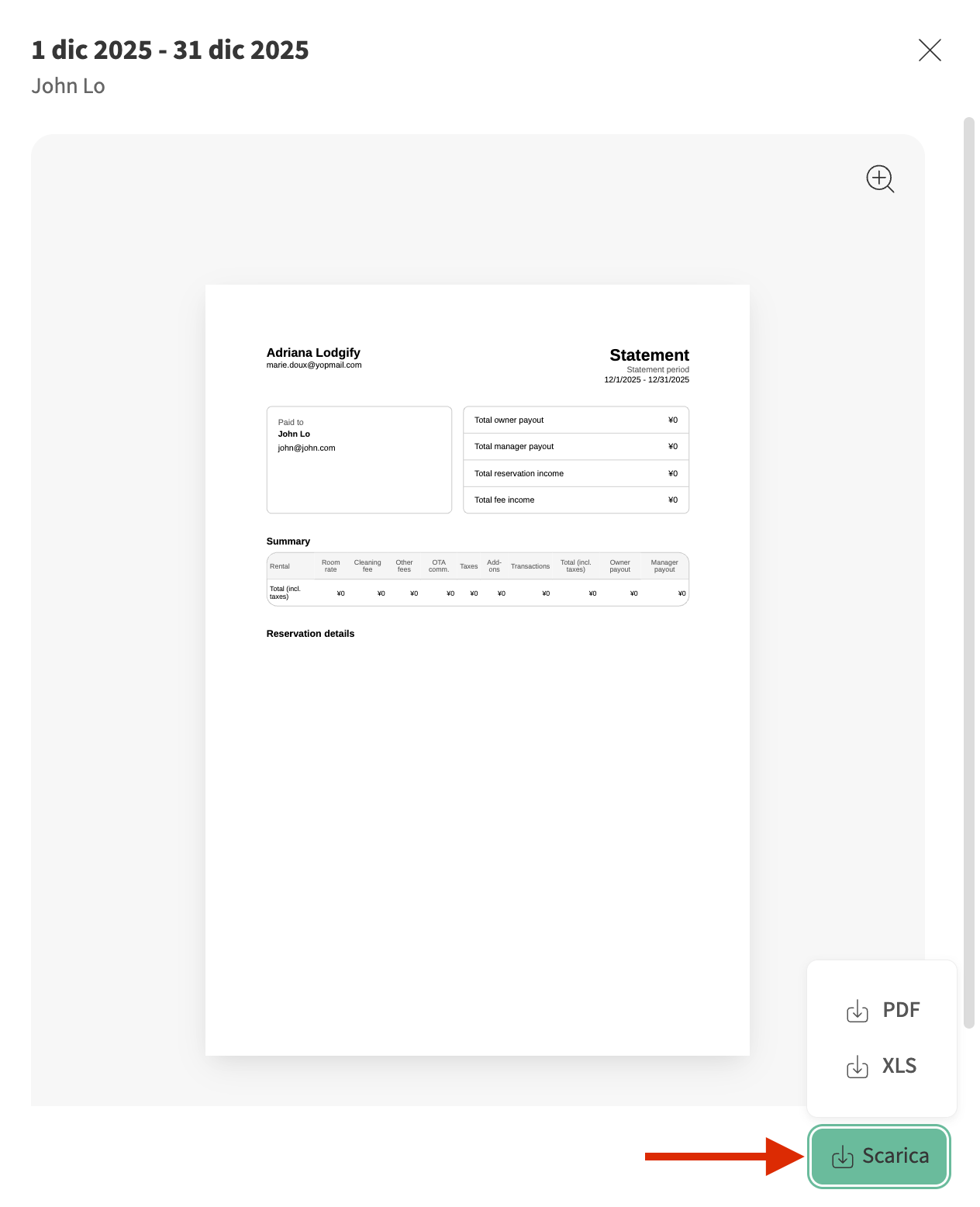 Puoi scaricare i tuoi resoconti per i proprietari in PDF e XLS nel caso tu voglia conservarli o inviarli ai tuoi proprietari.