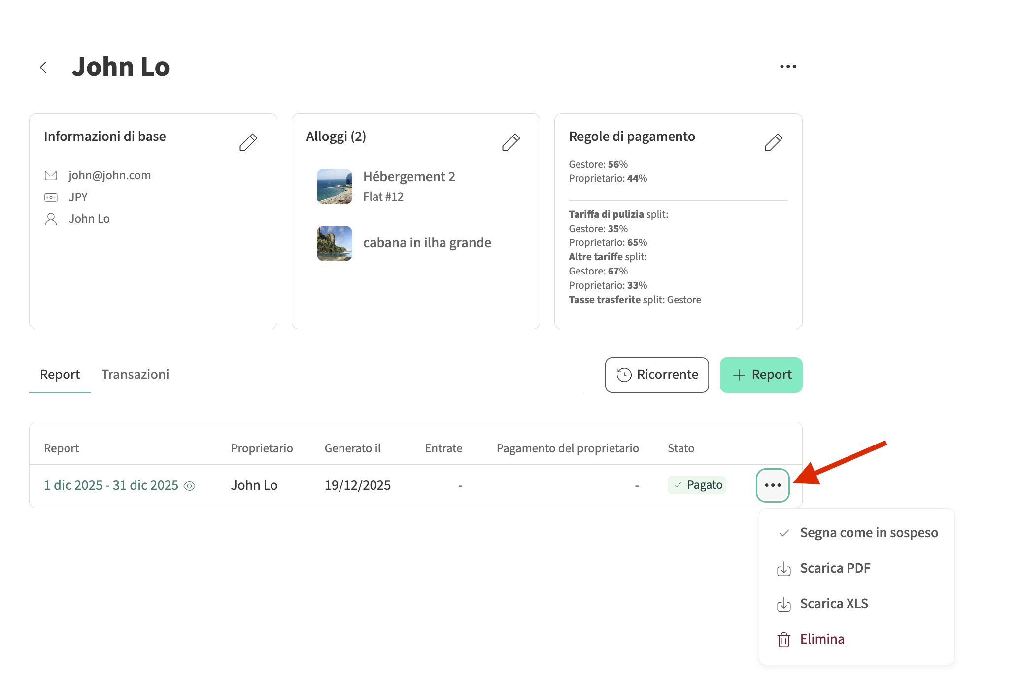 - Clicca sul proprietario associato, poi seleziona i tre puntini a destra del resoconto che desideri segnare come pagato e clicca su Segna come pagato.