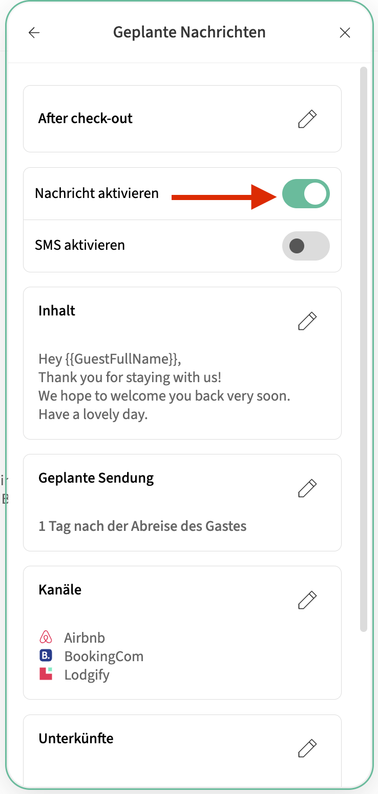 Questi messaggi programmati sono pensati per i tuoi Ospiti. Se vuoi inviare messaggi automatici al contatto dell’Alloggio e/o al contatto dell’account, segui le istruzioni riportate in questo articolo.
