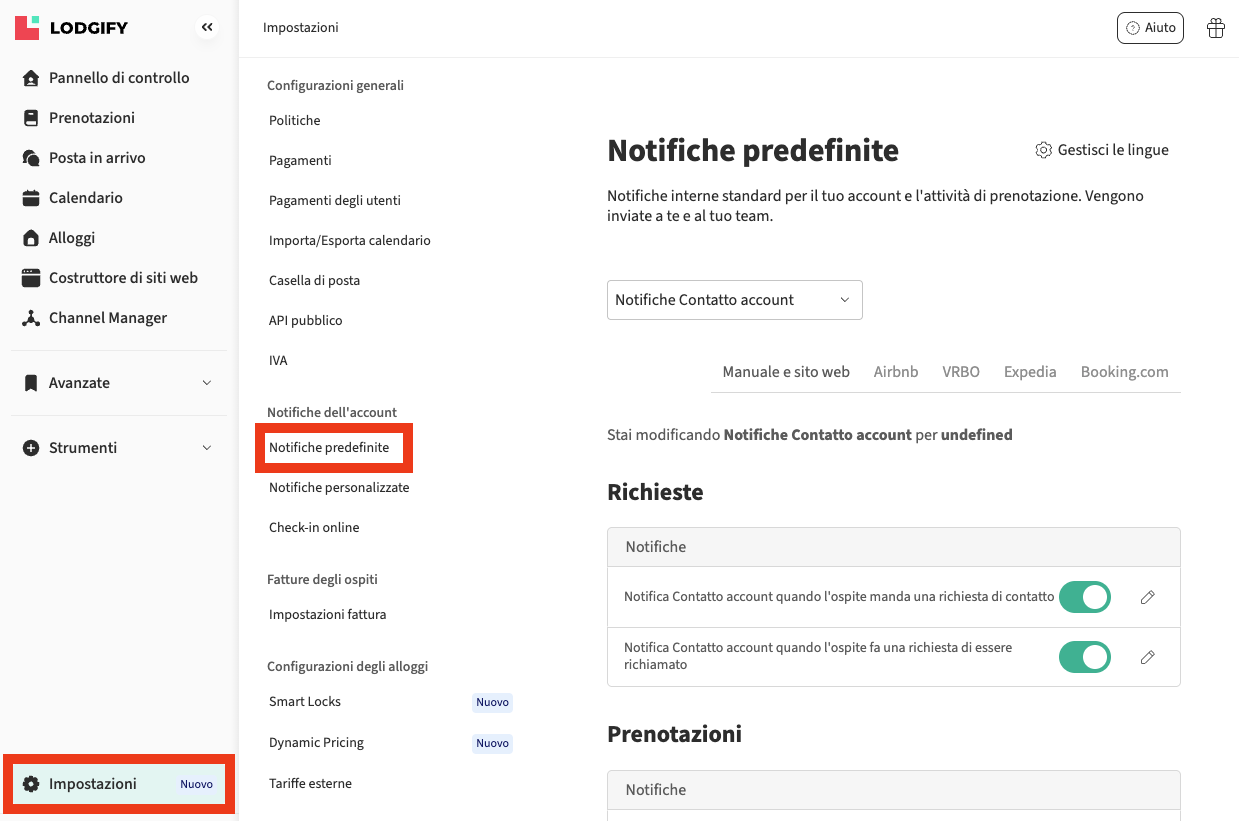 - Per quale fonte di prenotazione desideri configurare la notifica predefinita (Manuale e sito web, Airbnb, VRBO, Expedia, Booking.com)