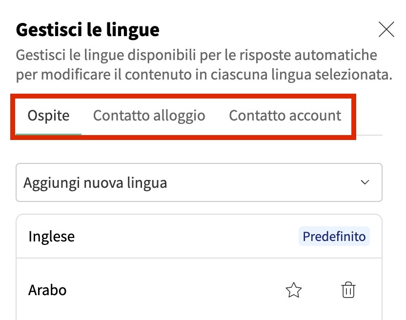 Per i contatti alloggio e account, la lingua utilizzata è la lingua dell’account. Se vuoi cambiarla, dovrai modificare la lingua dell’account nelle impostazioni dell’account.