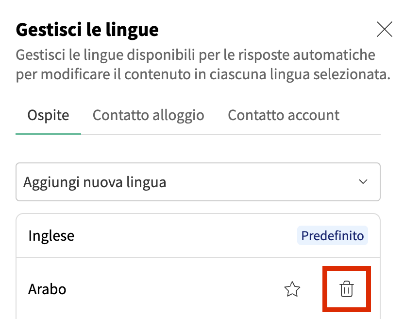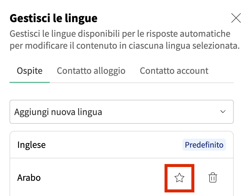 Per gli ospiti, puoi aggiungere, rimuovere e impostare una lingua predefinita per i messaggi: