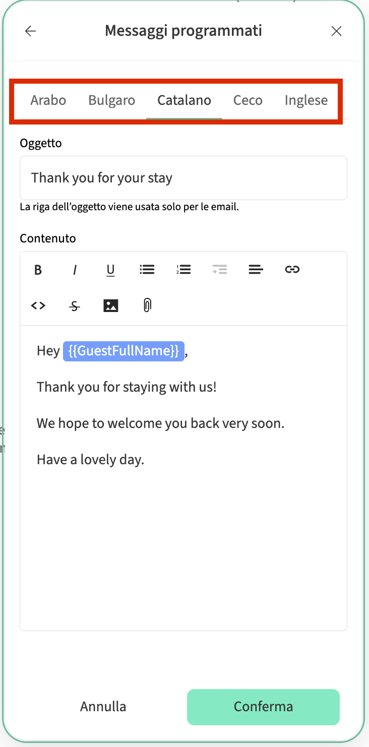 Se il tuo sito web supporta più lingue, è importante creare messaggi programmati e risposte rapide per ogni lingua che offri. In questo modo, gli ospiti riceveranno i messaggi nella loro lingua preferita ogni volta che è possibile.