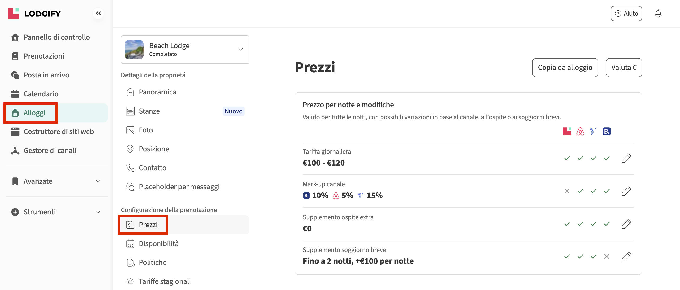 - Seleziona l'alloggio che desideri modificare e vai a Prezzi.