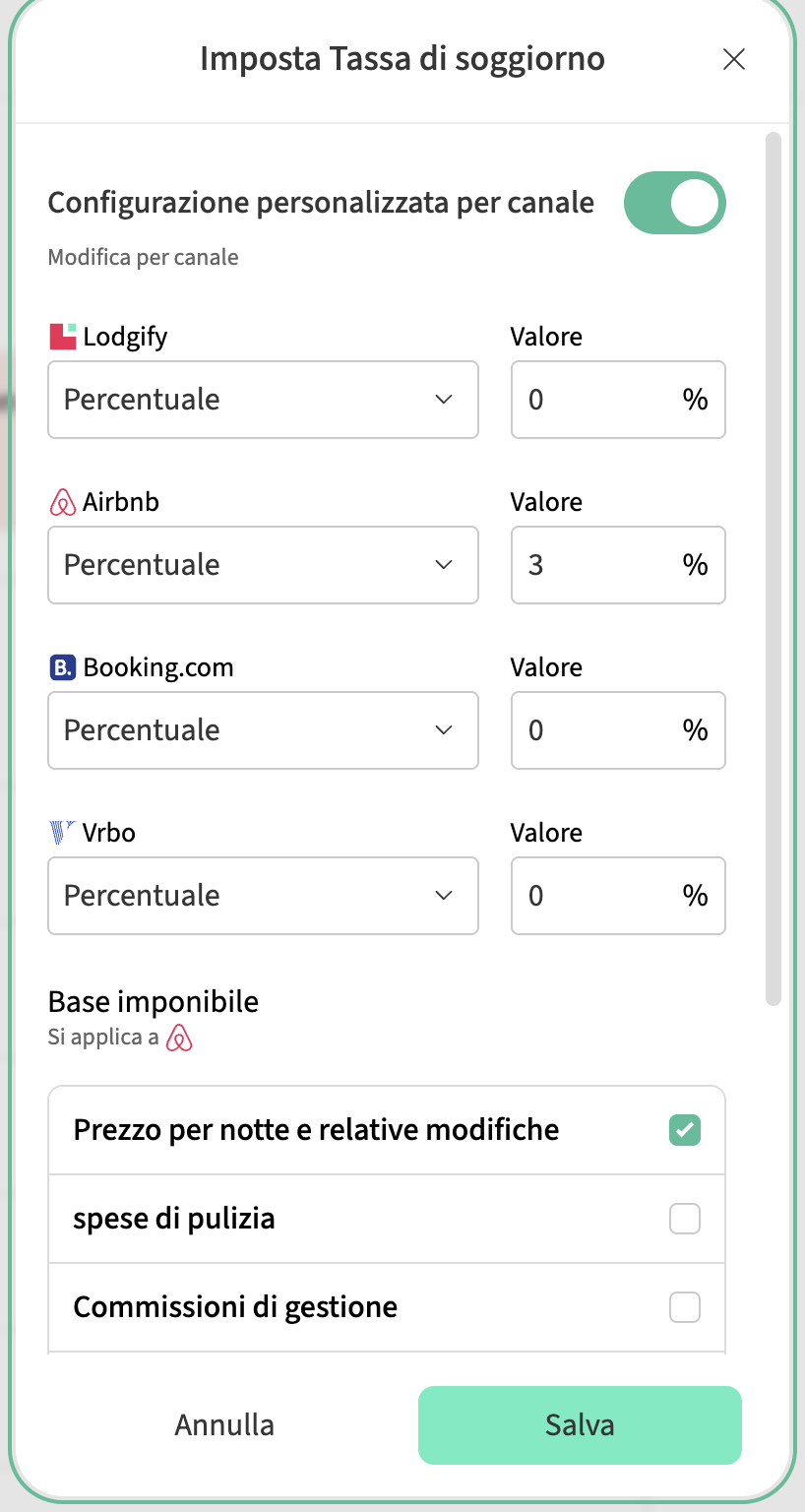 Se non vuoi inviare costi ad Airbnb perché sono già calcolati direttamente da Airbnb o non vuoi che siano inclusi nella tariffa della camera, puoi utilizzare Configurazione personalizzata per canale e impostare il valore della tassa a 0 per Airbnb.