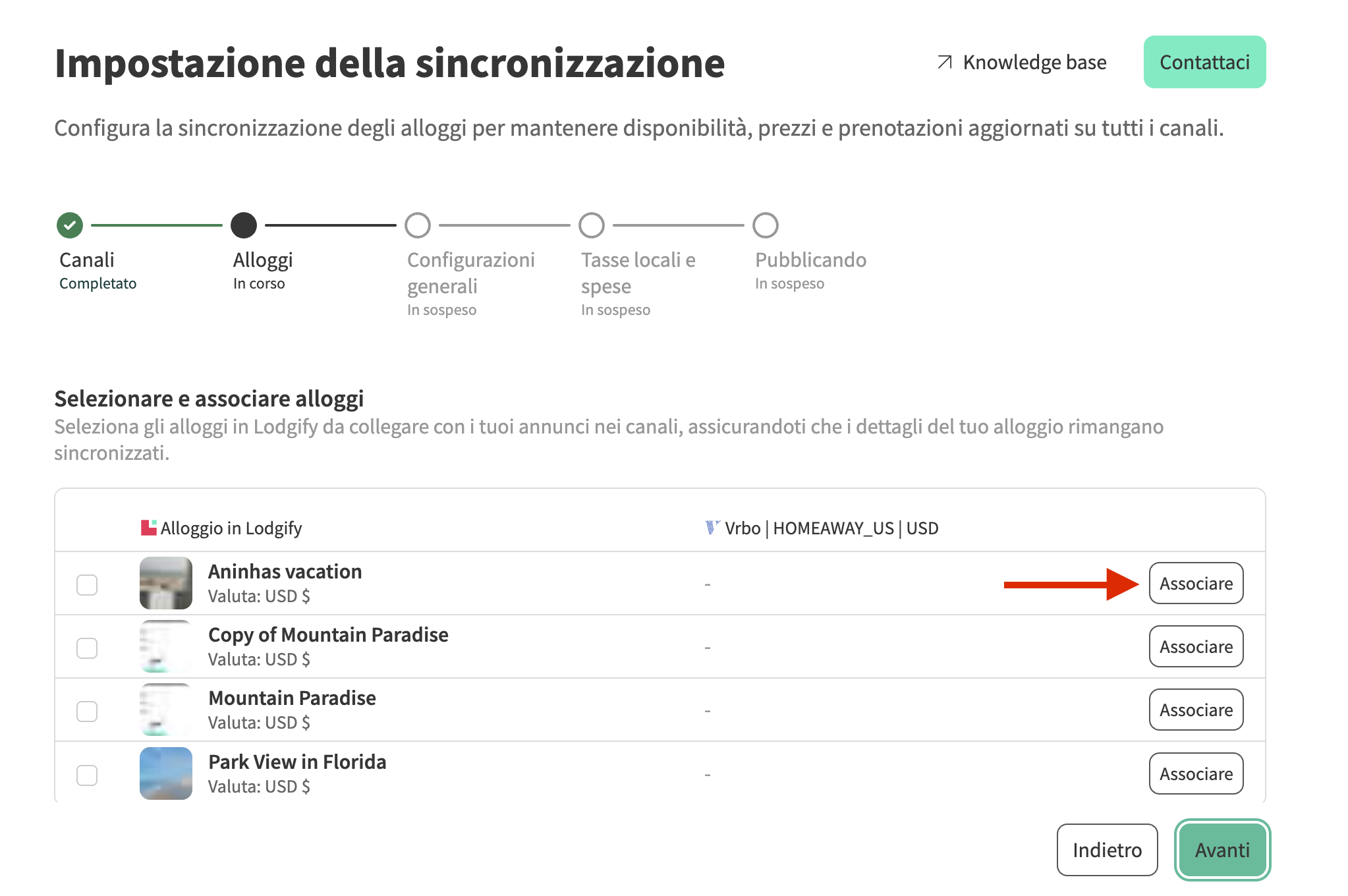 ⚠️ Importante: Tutti i tuoi alloggi Vrbo devono essere mappati se sei un utente Vrbo con annunci attivi, altrimenti saranno archiviati su Vrbo. Se un annuncio non mappato ha una prenotazione attiva, non potrai continuare la connessione. Tutti gli annunci con prenotazioni attive devono essere mappati. Questo è un requisito di Vrbo per le connessioni con software di terze parti. - Una volta mappati tutti gli alloggi desiderati, fai clic su Avanti.
