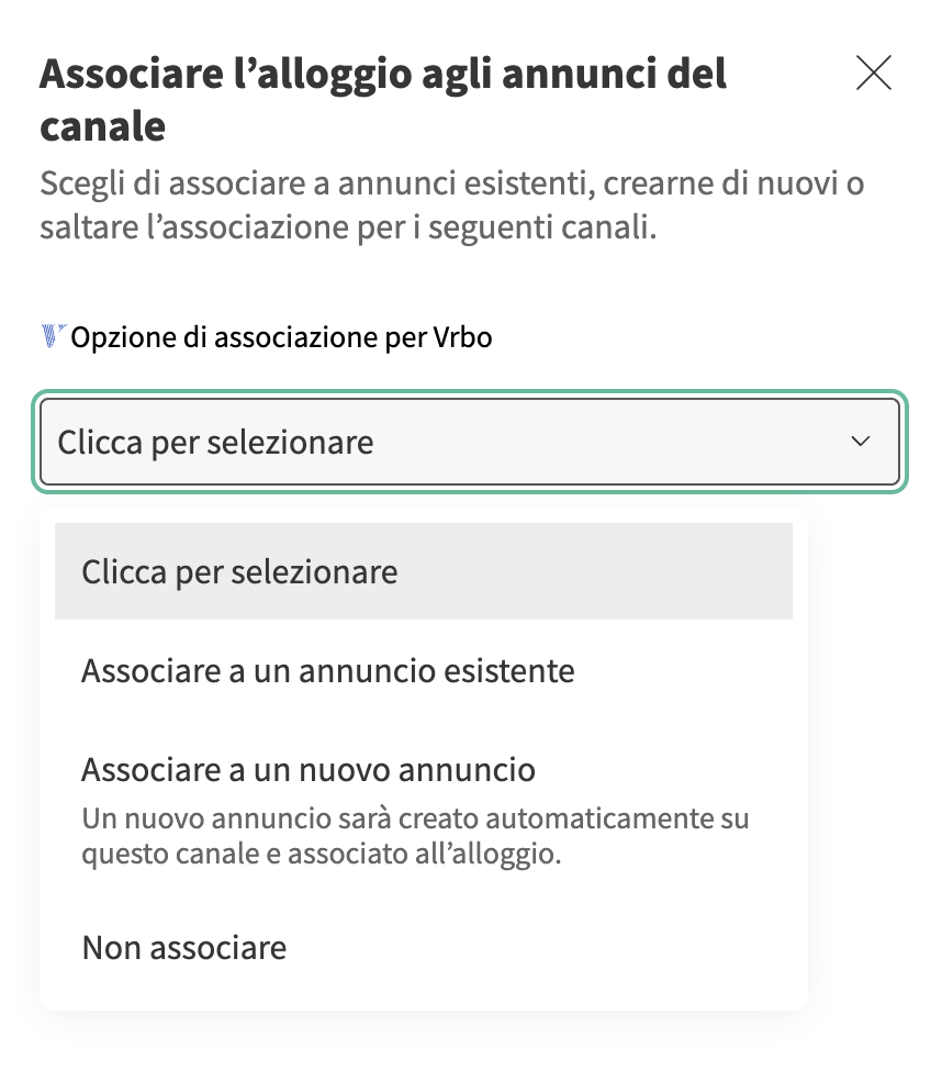 Seleziona l'annuncio Vrbo corrispondente dal menu a discesa. - Associare a un nuovo annuncio: il tuo alloggio non è presente su Vrbo e vuoi pubblicarlo lì.