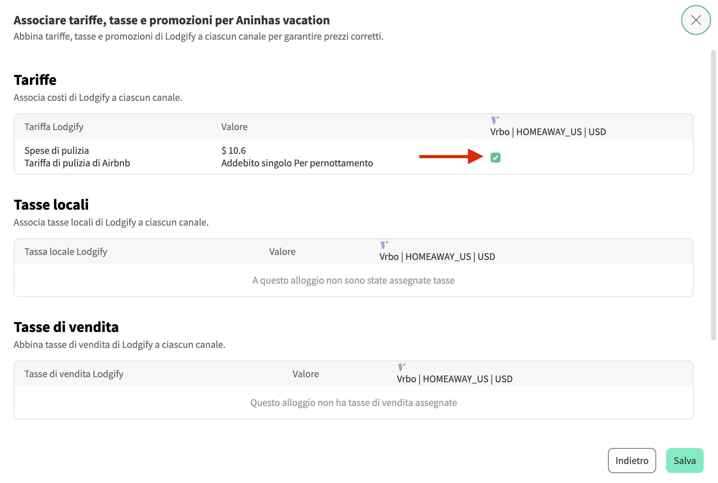 - Ora potrai rivedere come le tue spese, imposte e sconti impostate in Lodgify vengono inviate a Vrbo per ciascun alloggio.