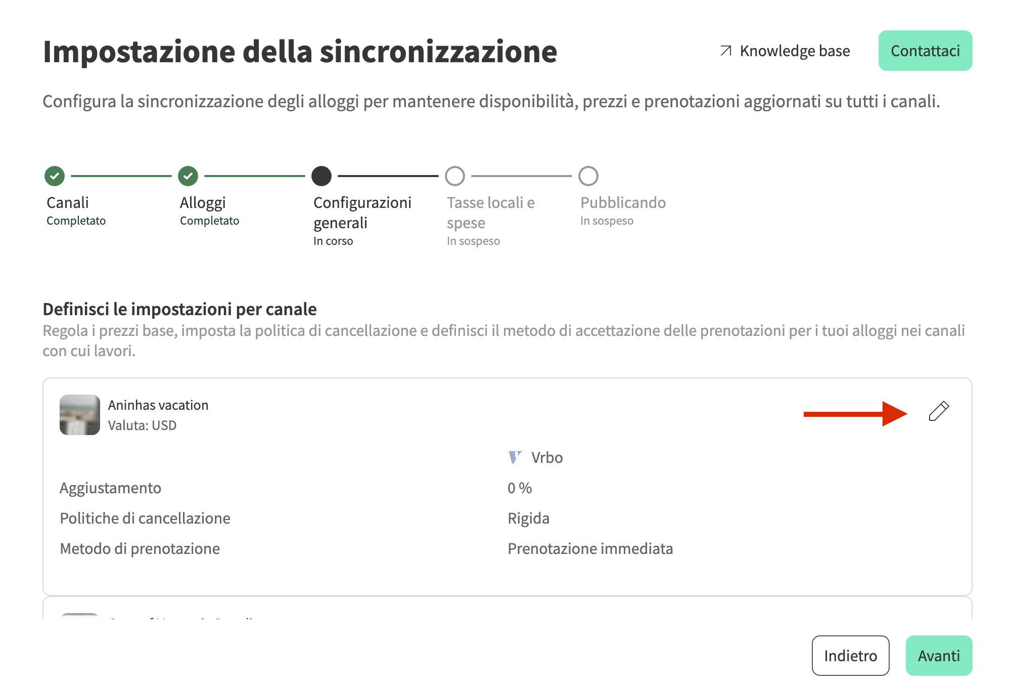 - Puoi visualizzare e modificare le impostazioni di Vrbo per ogni alloggio cliccando sull’icona a forma di penna, quindi su Avanti.