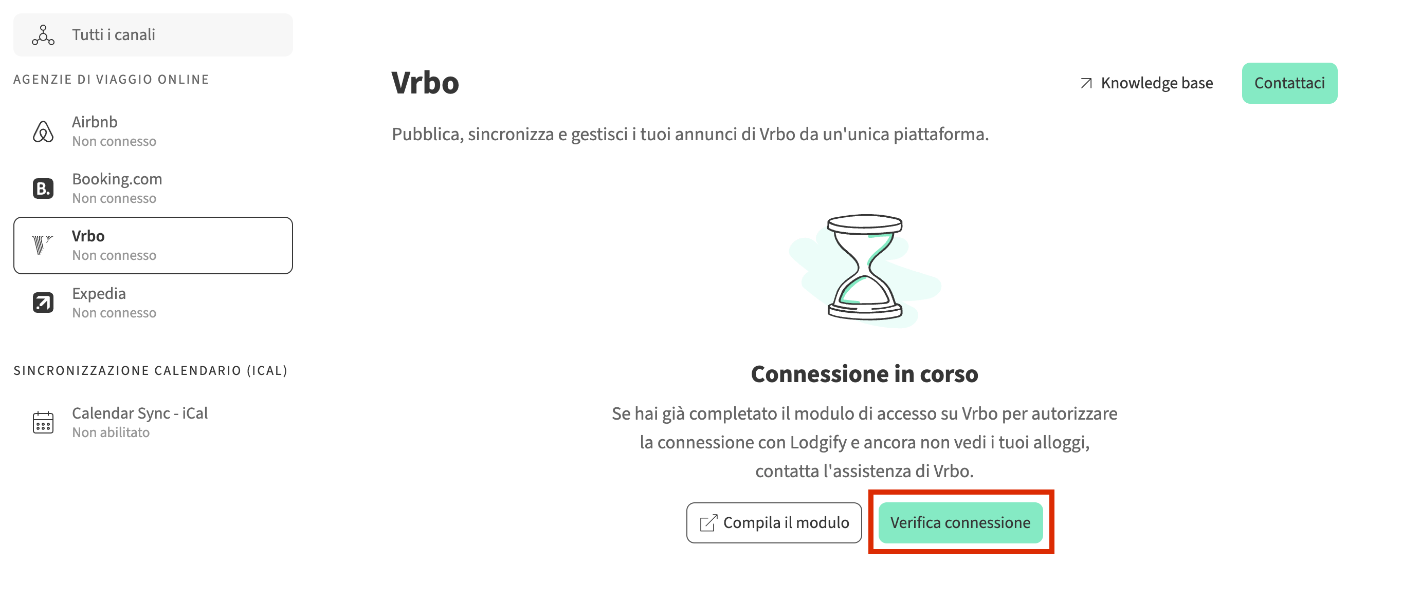 - Nella maggior parte dei casi, la connessione viene completata immediatamente dopo l’invio delle informazioni. Tuttavia, potrebbe esserci un ritardo nella conferma da parte di Vrbo; puoi controllare lo stato in qualsiasi momento tramite il pulsante Verifica connessione.
