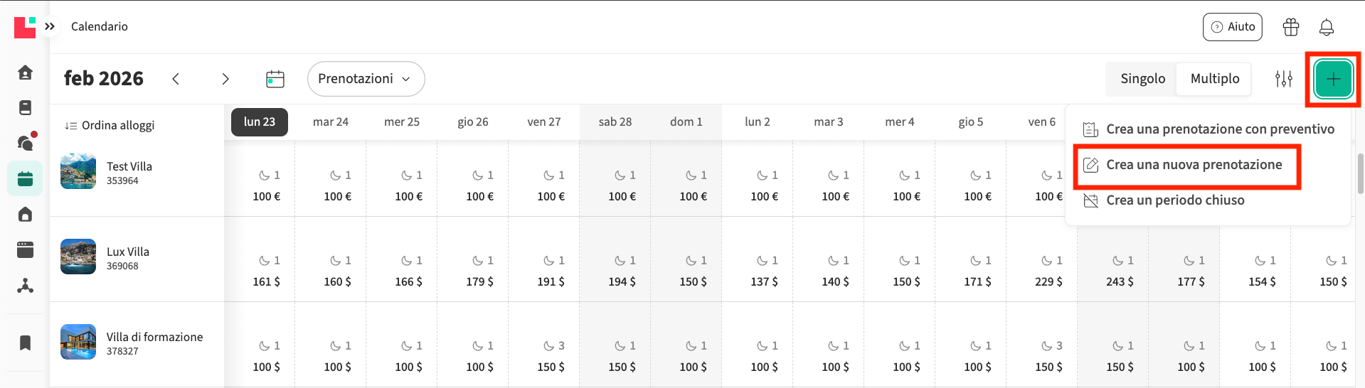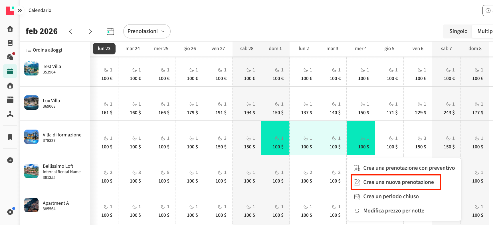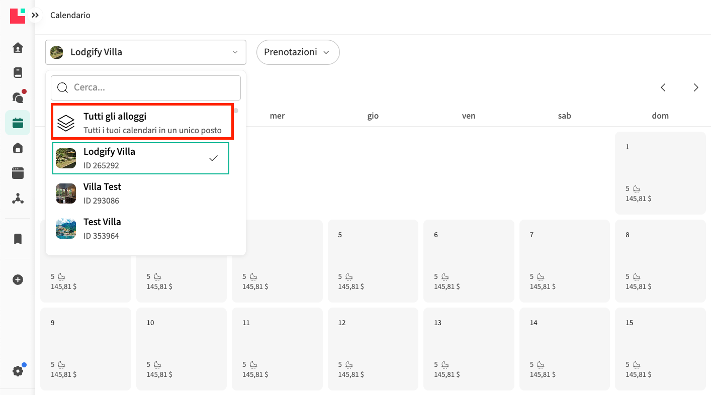 - Vai al menu a sinistra e seleziona Calendario. Vai al calendario Tutti gli Appartamenti (vista Multi):