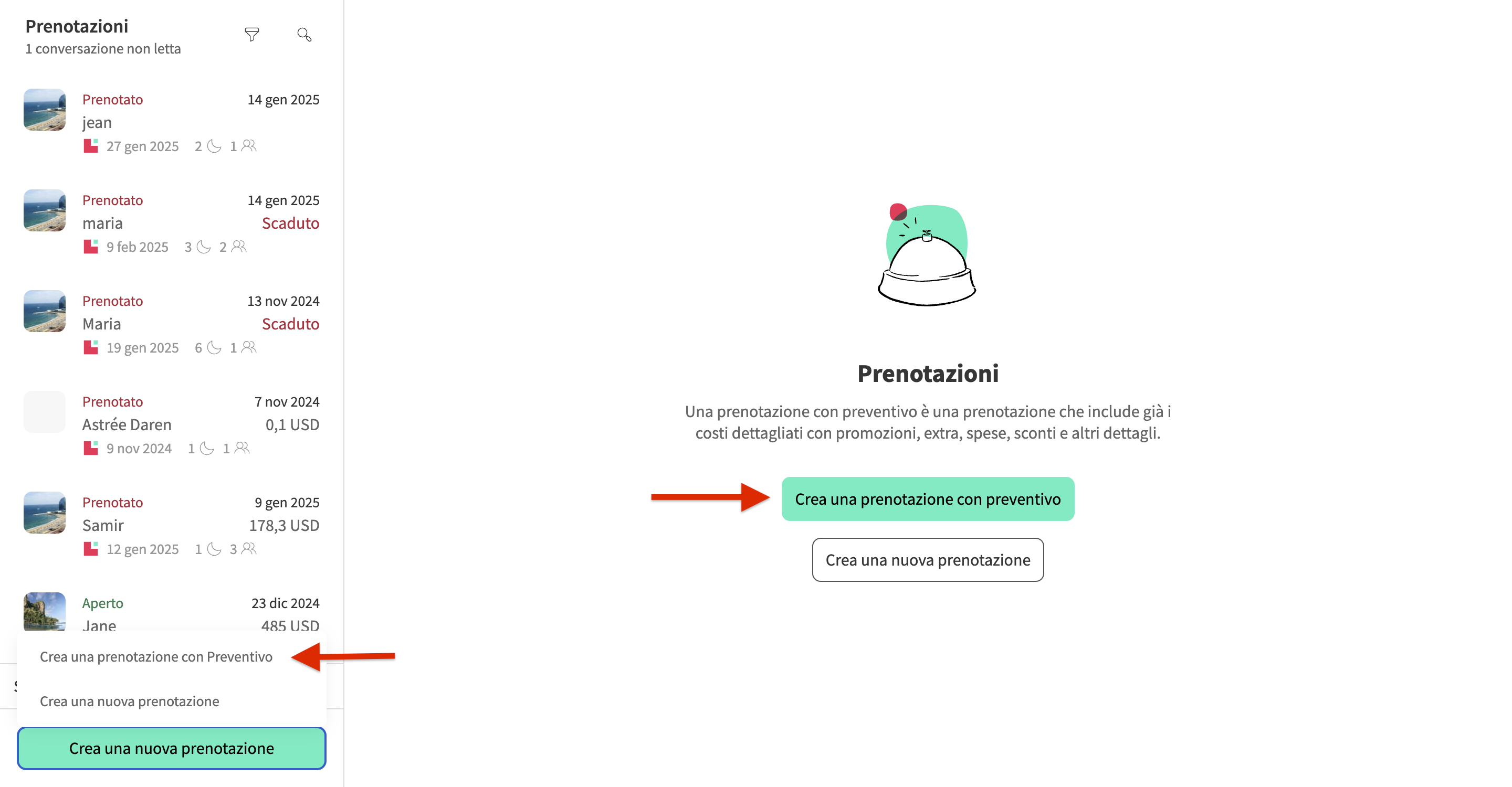- Clicca su Crea prenotazione e seleziona Crea prenotazione con preventivo.