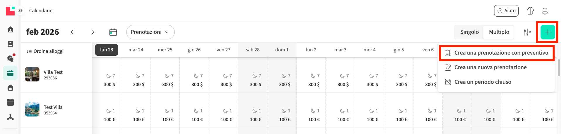 - Se rimani nella vista del calendario del singolo appartamento, puoi anche creare una prenotazione con preventivo: