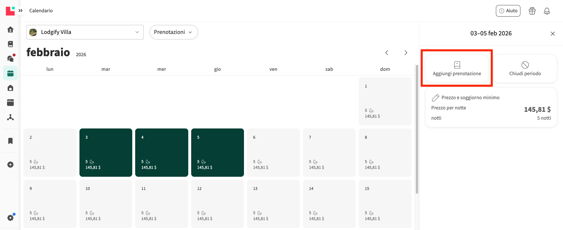 - Seleziona le date e poi clicca su Aggiungi prenotazione nel pannello laterale destro.