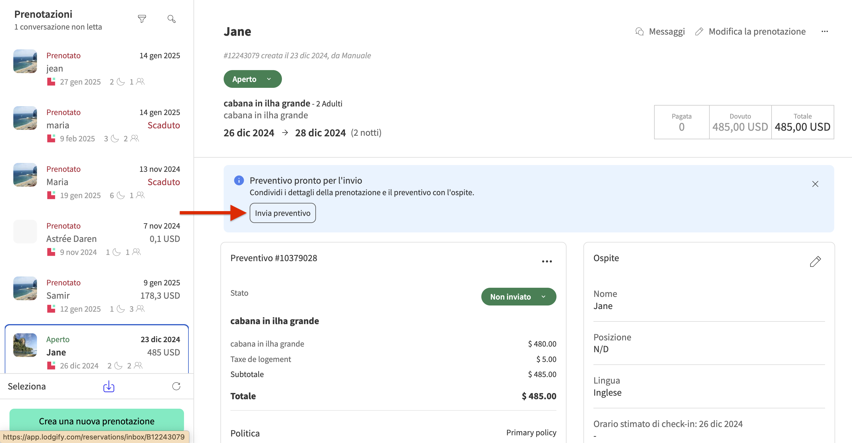 - Poi, torna alla tua prenotazione e reinvia il preventivo cliccando su Invia preventivo nel banner blu, oppure selezionando Non inviato e scegliendo Invia preventivo.