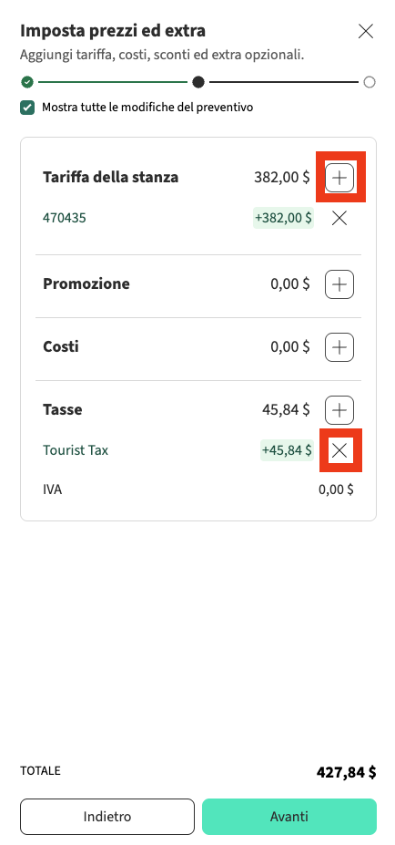 💡 Nota: Nell’applicazione mobile puoi anche impostare un numero di ospiti predefinito. - Nella pagina successiva, verifica i dettagli del prezzo e gli extra. Puoi usare le icone della somma o della croce se devi modificare qualcosa, quindi clicca su Avanti.