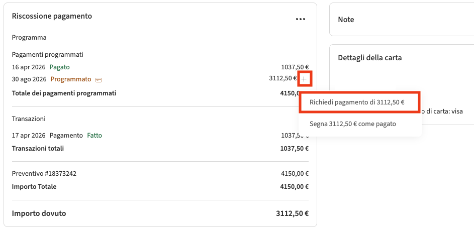 Per farlo, apri la prenotazione, clicca sull'icona "+" accanto alla riga di pagamento e seleziona "Richiedi pagamento".