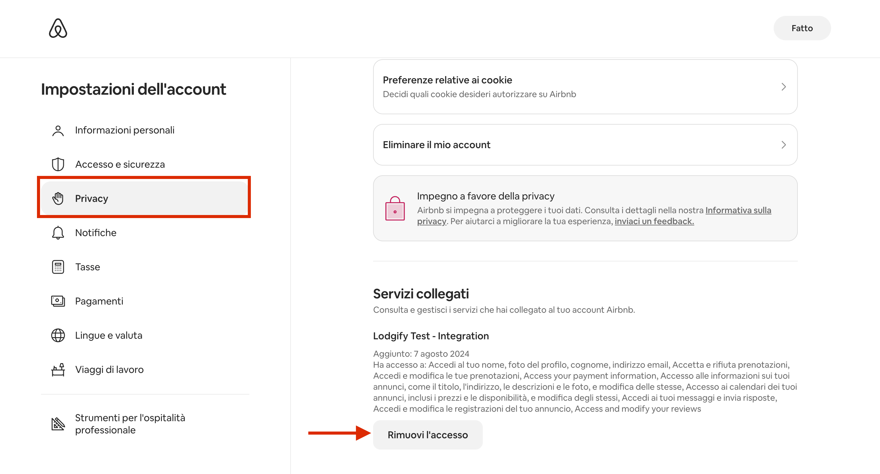 - Scorri fino a Servizi collegati, trova Lodgify e clicca su Rimuovi l'accesso.
