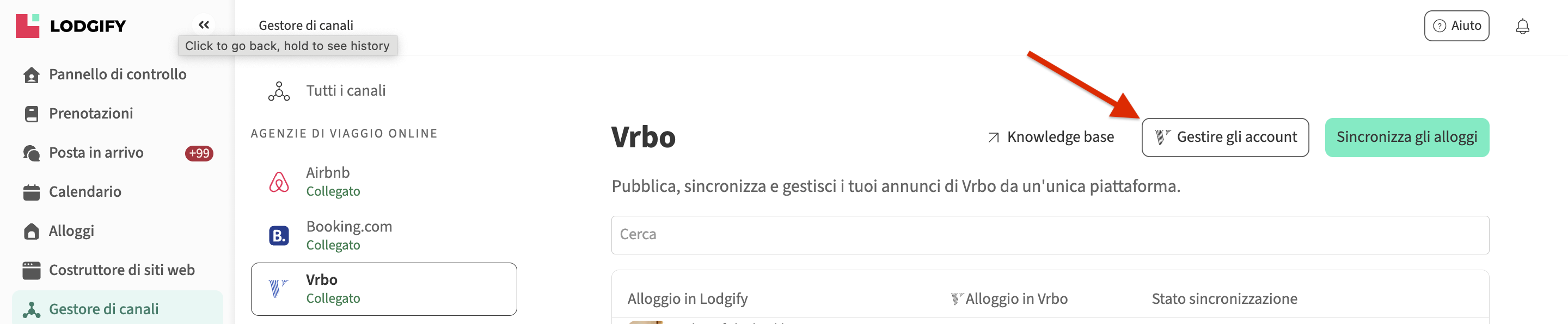 - Vai al menu a sinistra e seleziona Channel Manager, quindi clicca su Vrbo.