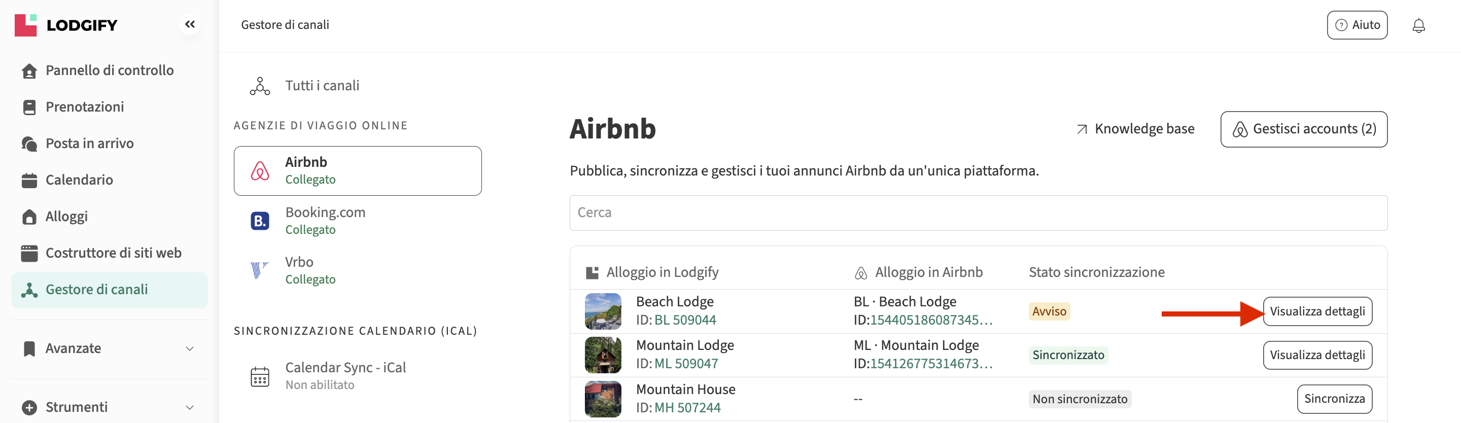 - Scegli Airbnb e, accanto all’Alloggio che vuoi disconnettere, clicca fai clic su Visualizza dettagli.