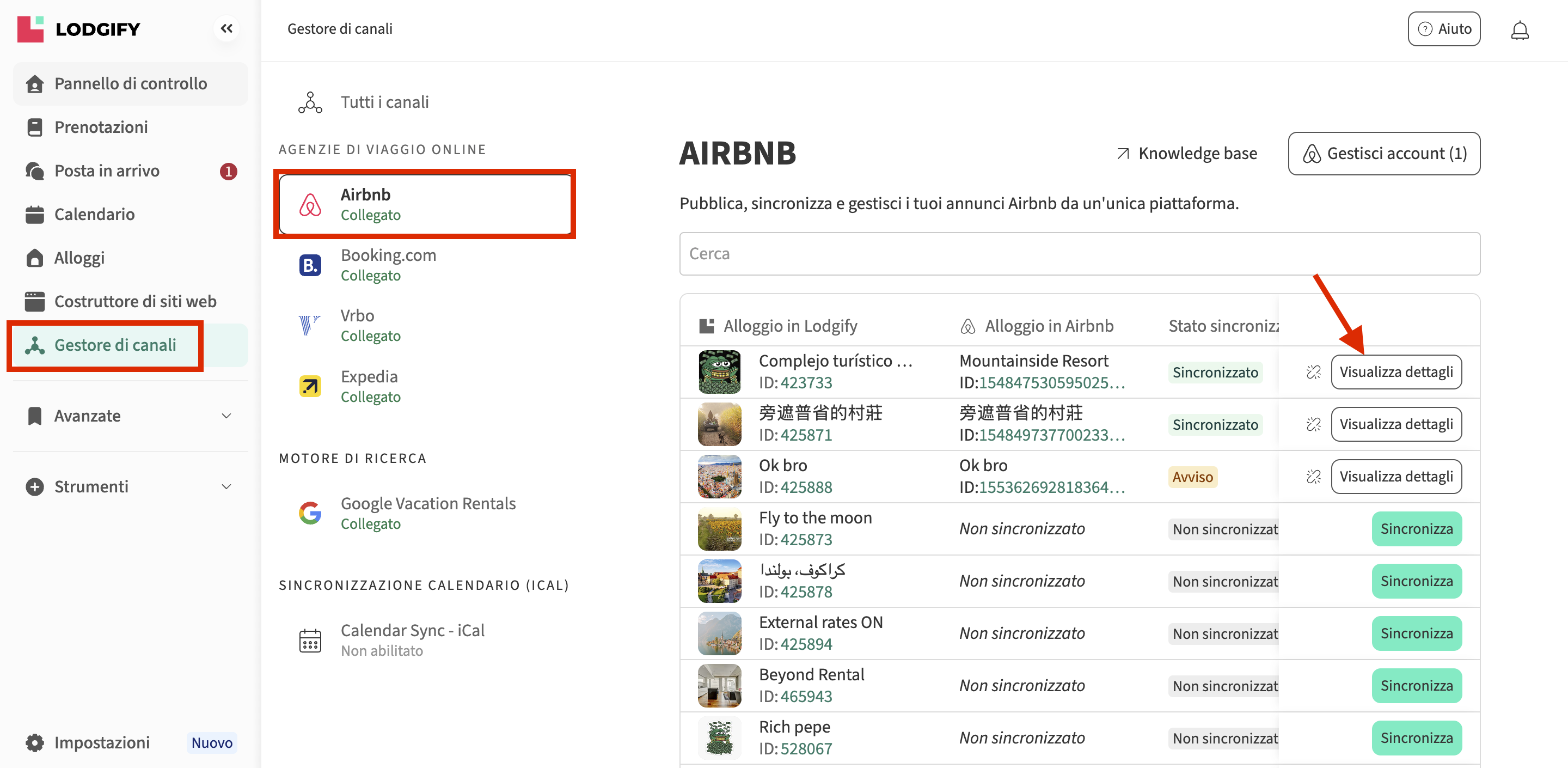 Se il tuo alloggio è connesso a Airbnb tramite il Channel Manager, puoi visualizzare e gestire la tua connessione direttamente nel Gestore di canali.