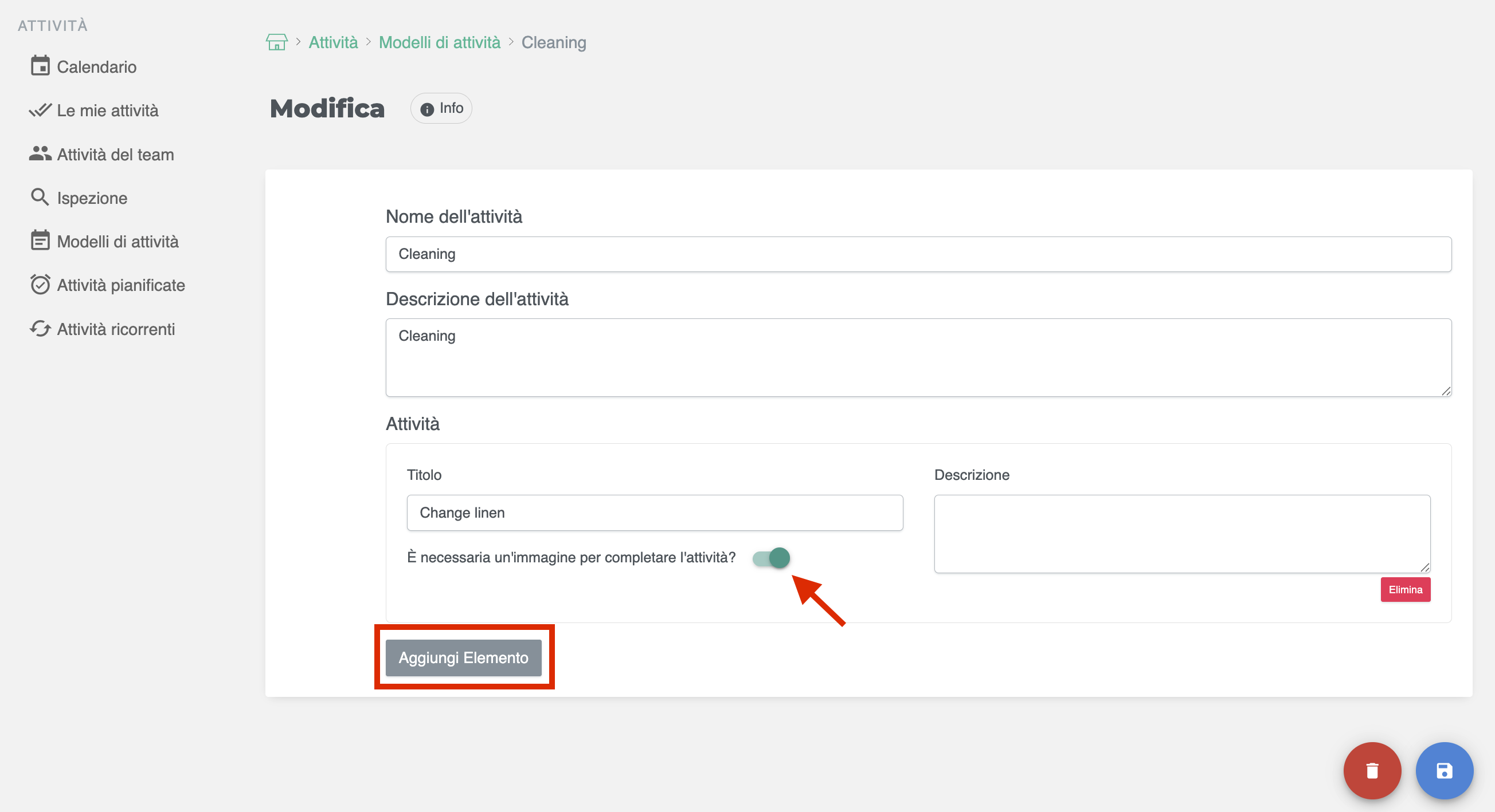 Se vuoi che l'utente scatti una foto dell’attività completata affinché venga considerata completa, attiva l'interruttore accanto alla frase È necessaria un'immagine per completare l'attività?