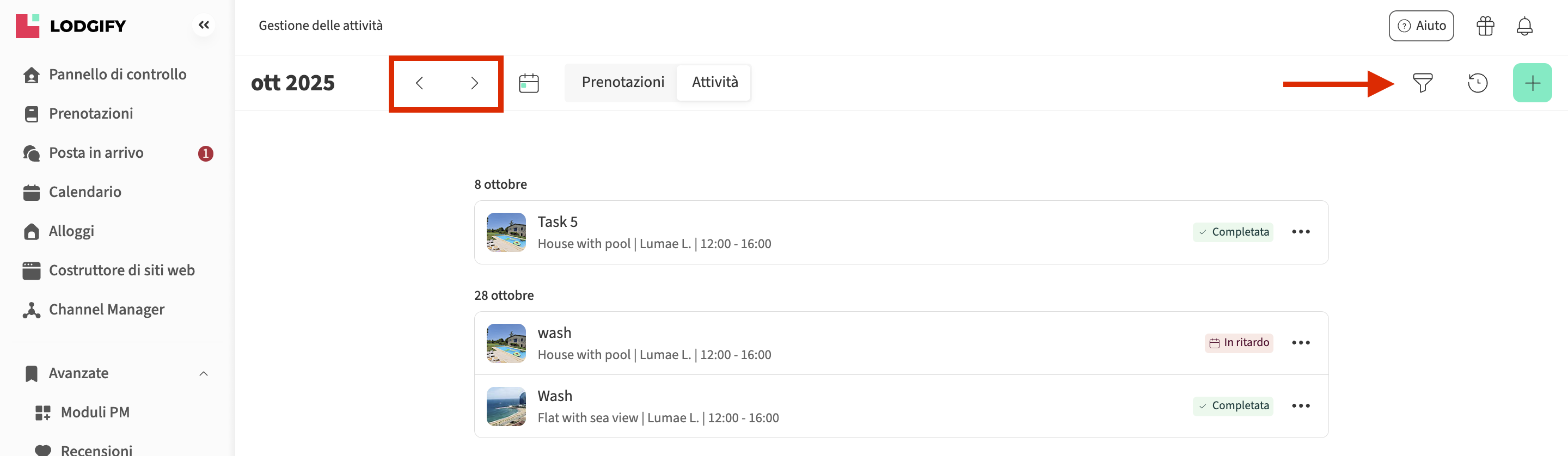 - Il personale di pulizia, i proprietari dell'alloggio e gli agenti di check-in possono visualizzare solo le attività collegate ai loro alloggi assegnati o alle attività senza alloggio.