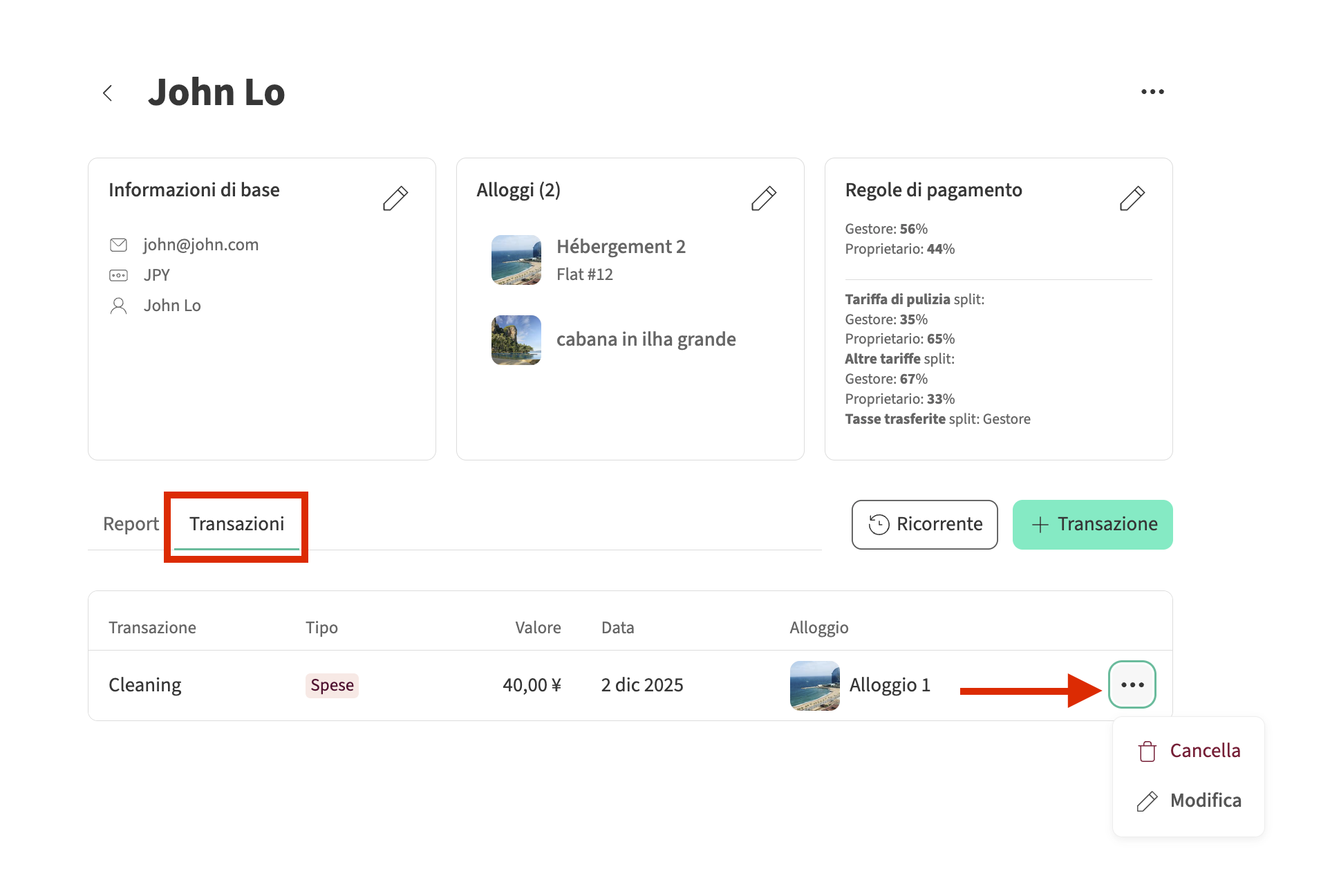 Clicca sul proprietario la cui transazione desideri modificare o rimuovere, seleziona Transazioni e poi clicca sui tre puntini a destra e seleziona Modifica o Elimina.