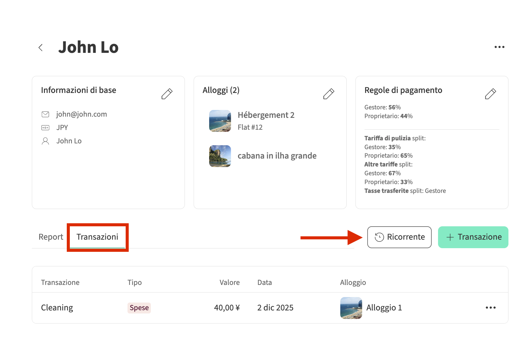 - Clicca sul proprietario per cui desideri creare una nuova transazione, poi seleziona Transazioni e + Transazione.