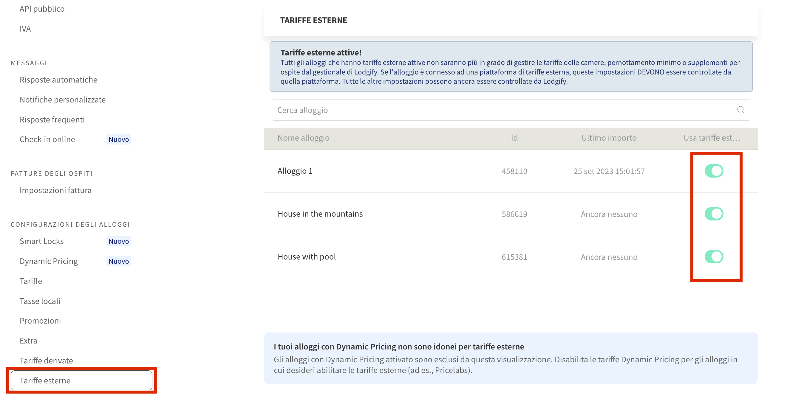 💡 Nota: Una volta che le tariffe esterne sono attivate per un affitto, le tariffe e il soggiorno minimo non saranno più gestiti in Lodgify.