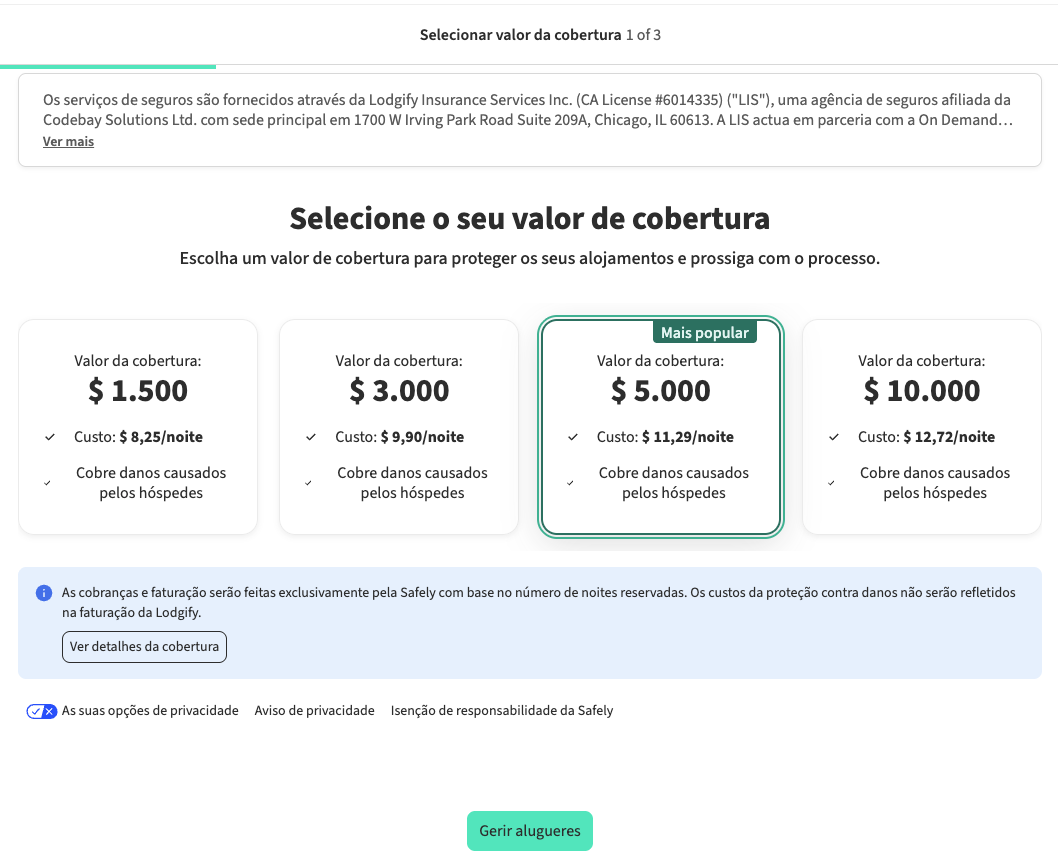 Os serviços de seguro são prestados através da Lodgify Insurance Services Inc. (Licença CA #6014335) (“LIS”), uma agência de seguros afiliada à Codebay Solutions Ltd., com sede em 1700 W Irving Park Road Suite 209A, Chicago, IL 60613. A LIS atua em parceria com a On Demand Insurance Agency, LLC (dba Safely), uma agência de seguros independente que oferece produtos da Obsidian Specialty Insurance Company (NAIC# 16871). A LIS está licenciada como agência de seguros de bens e acidentes em todas as jurisdições onde oferece produtos de seguro (consulte mais informações sobre licenças aqui). Nem todas as coberturas ou produtos de seguro estão disponíveis em todas as jurisdições. Todos os produtos de seguro estão sujeitos aos termos, condições, limitações e exclusões constantes na apólice aplicável. A cobertura está sujeita ao texto da apólice. A LIS pode receber uma comissão, taxa ou outra compensação pelos seus serviços.