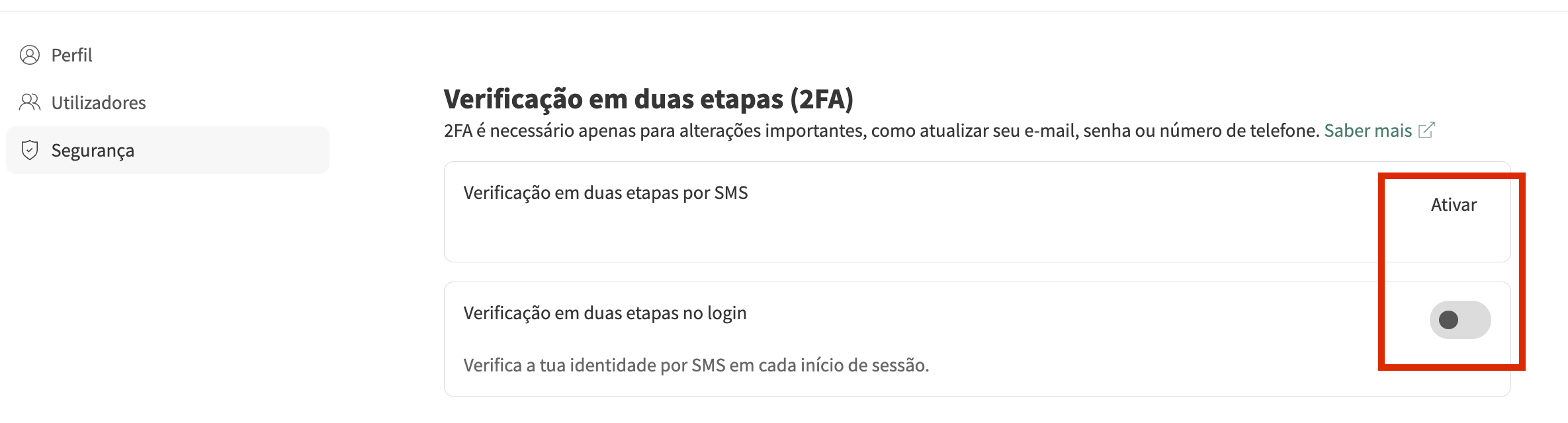💡 Nota: O número de telefone que usa para a autenticação 2FA pode ser diferente do número de telefone principal guardado na página do seu perfil.