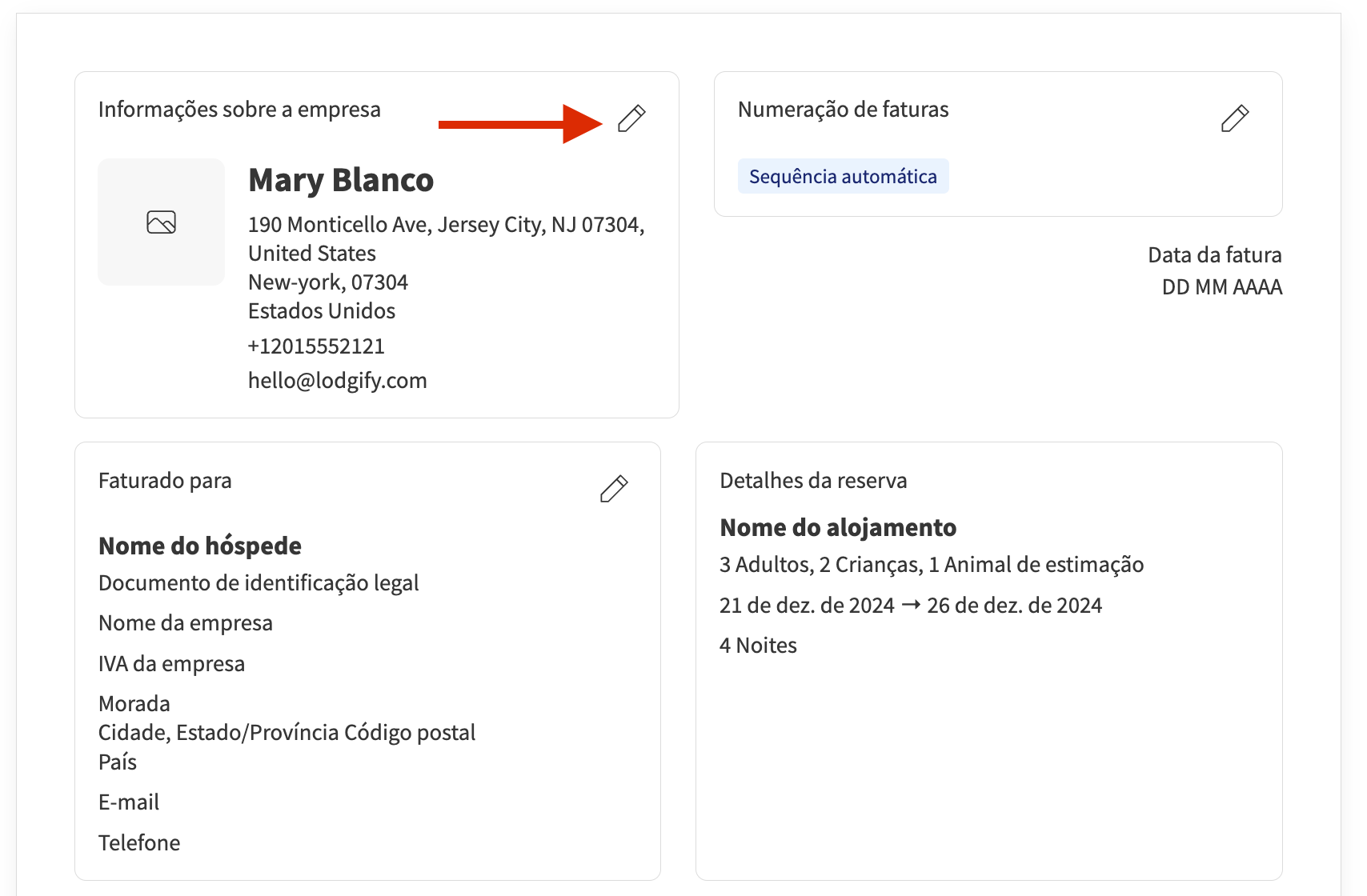 - Uma janela destacada será aberta, permitindo-lhe editar as informações da empresa e do hóspede que aparecerão na fatura.