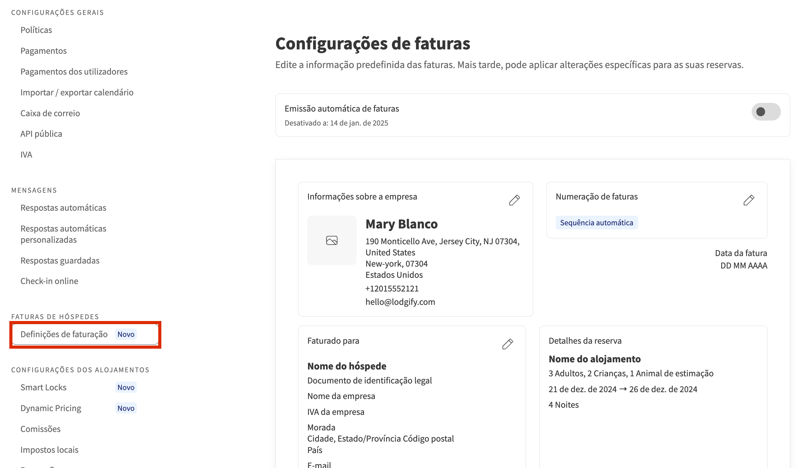 Nas configurações de faturas, pode personalizar o modelo da sua fatura, atualizar as informações da sua empresa, detalhes dos hóspedes, notas, numeração de faturas e configurações de geração automática.